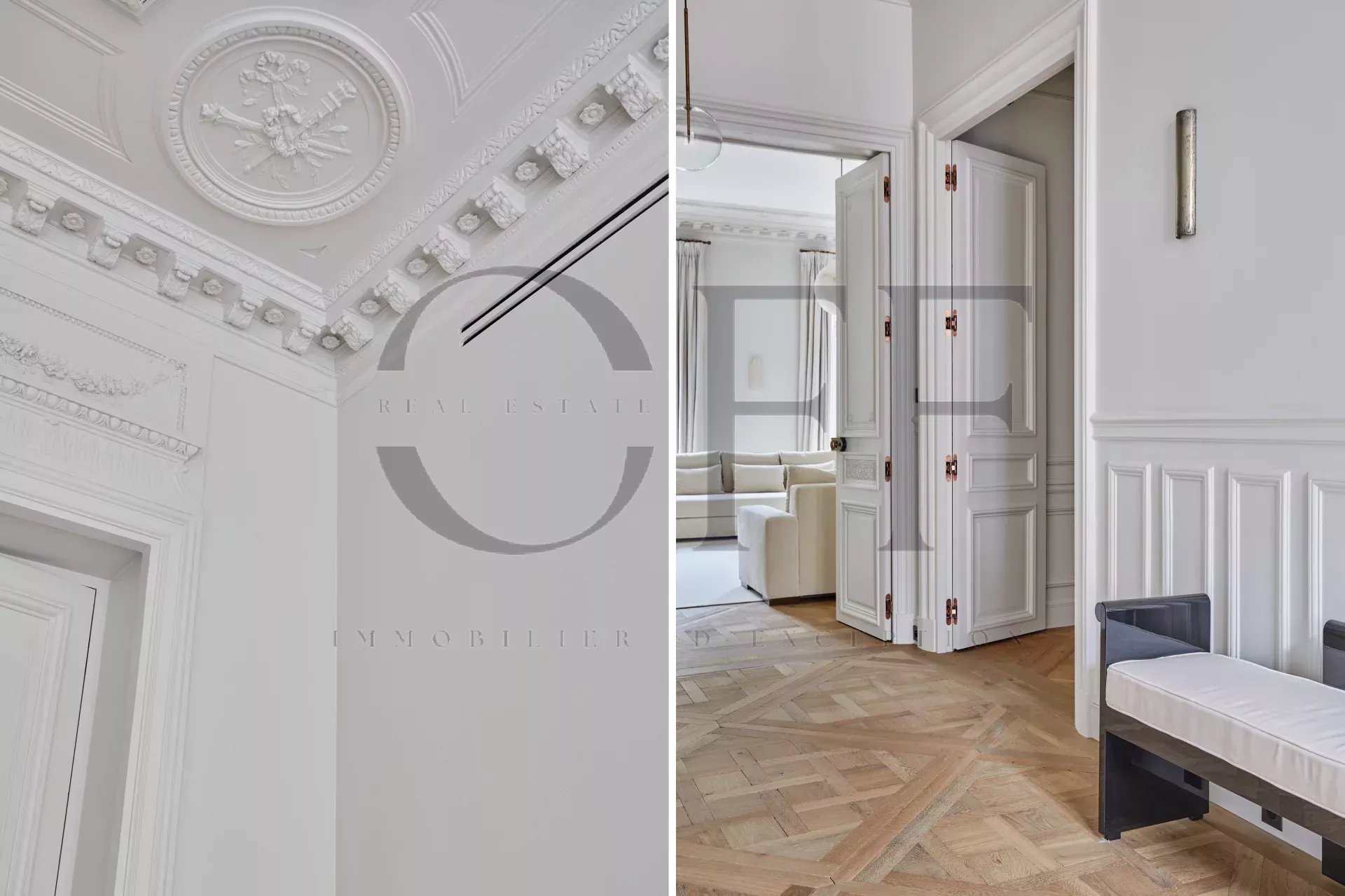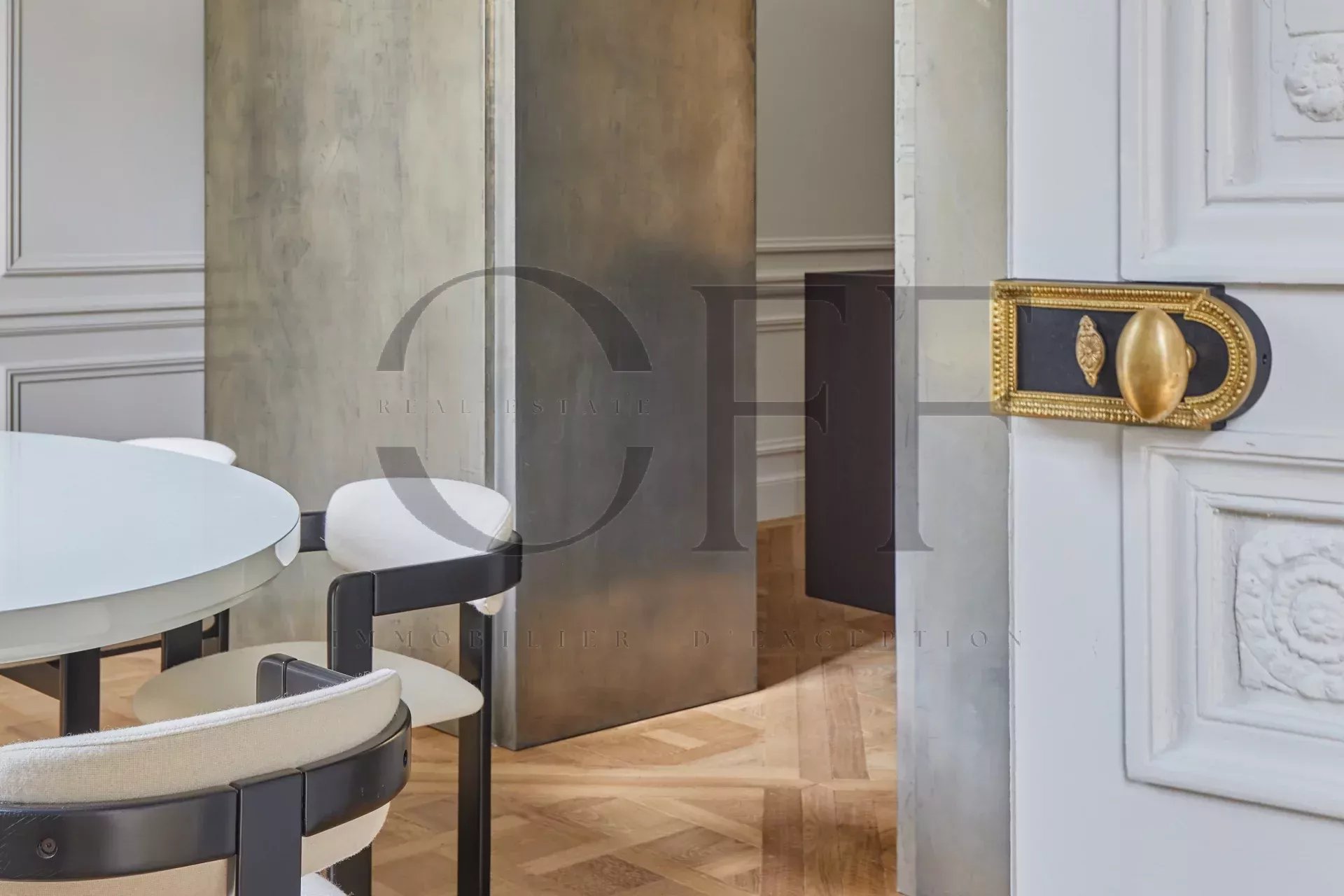 Idéalement situé avenue Marceau, à la lisière du Triangle d’Or, cet élégant 220 m² occupe l’étage noble d’un immeuble haussmannien en pierre de taille.